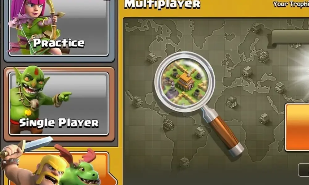 - ابتدا با کلیک روی دکمه “Attack” وارد بخش حمله شوید و حالت چندنفره (Multiplayer) را انتخاب کنید تا بتوانید به پایگاههای دیگر بازیکنان حمله کنید.